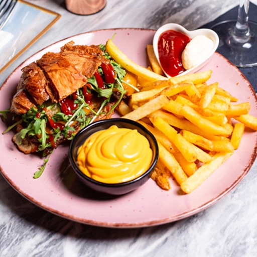 16,90 €Croissant with crispy chicken, cheddar cheese, rocket, gherkins, tomato, red onions, mayo and ketchup